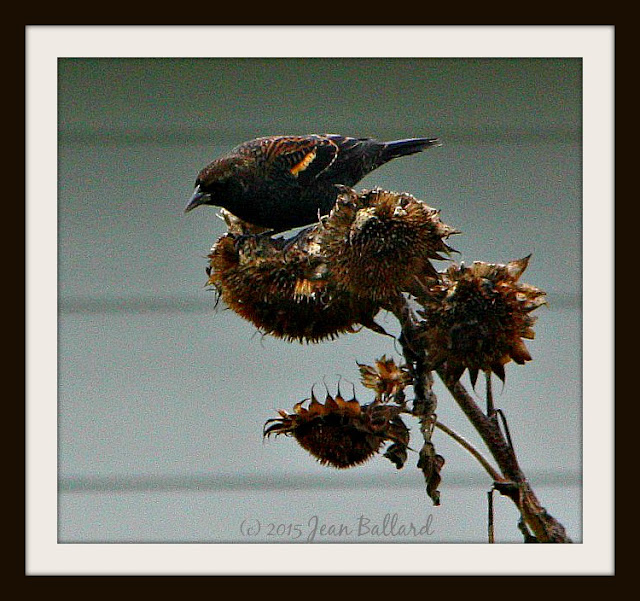I was working in the garden today when I glanced over at my neighbour's yard where many tall sunflowers have died back to leave only the seed heads on which the birds feast. The colourful stripe in this bird's wing caught my attention - he was flying with a group of starlings and had the mottled colouring of starlings, yet had the wing stripe of a red-winged blackbird. But the red-winged blackbirds I've often seen among reeds up at Crofton lake are a glossy black. Is it possible the two species of birds have intermingled and mated to produce a hybrid? A red-winged starling? A starbird? A blackling? Or perhaps it is just the red-winged blackbirds winter coat? Whatever it was, it made for an interesting photo.