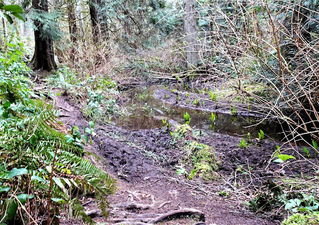 The trail of soft dirt with some roots, crosses Fairy Creek a couple of times, rustic bridges or boards and logs making the crossing easy. There was only one mucky section this day, in an area swampy enough to sprout Skunk Cabbage, also known as swamp tulips, bear's salad bar, and several other names. Whatever you call it, it's bright yellow popping up in early spring is always a welcome sight.